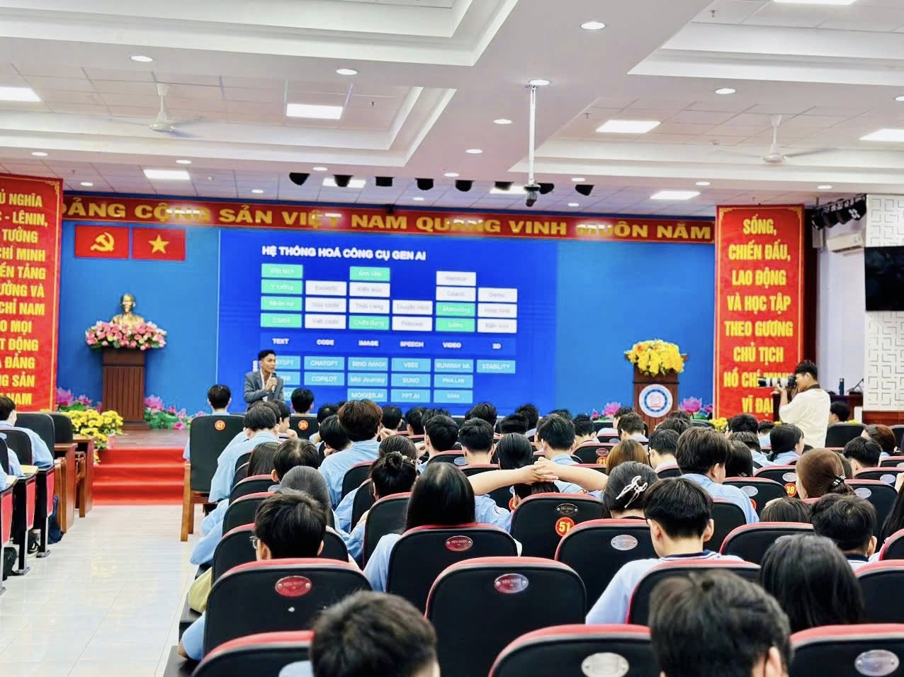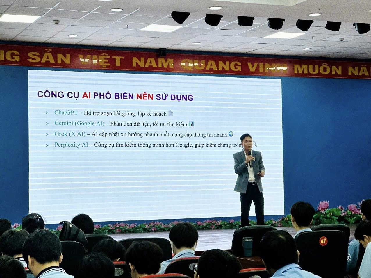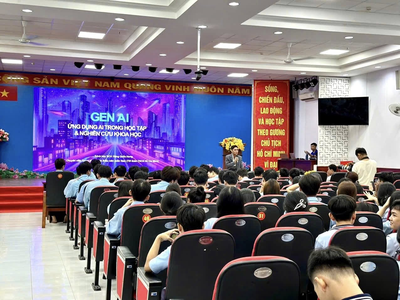 Với mục tiêu nâng cao nhận thức, trang bị kiến thức và kỹ năng ứng dụng công nghệ mới cho đoàn viên, hội viên, học sinh sinh viên trường trong thời đại chuyển đổi số, sáng ngày 10/6/2025, Đoàn thanh niên - Hội sinh viên trường đã phối hợp với Phòng Công tác Học sinh sinh viên tổ chức buổi tuyên truyền chuyên đề “Ứng dụng AI trong học tập và nghiên cứu khoa học” của Học sinh sinh viên trường.