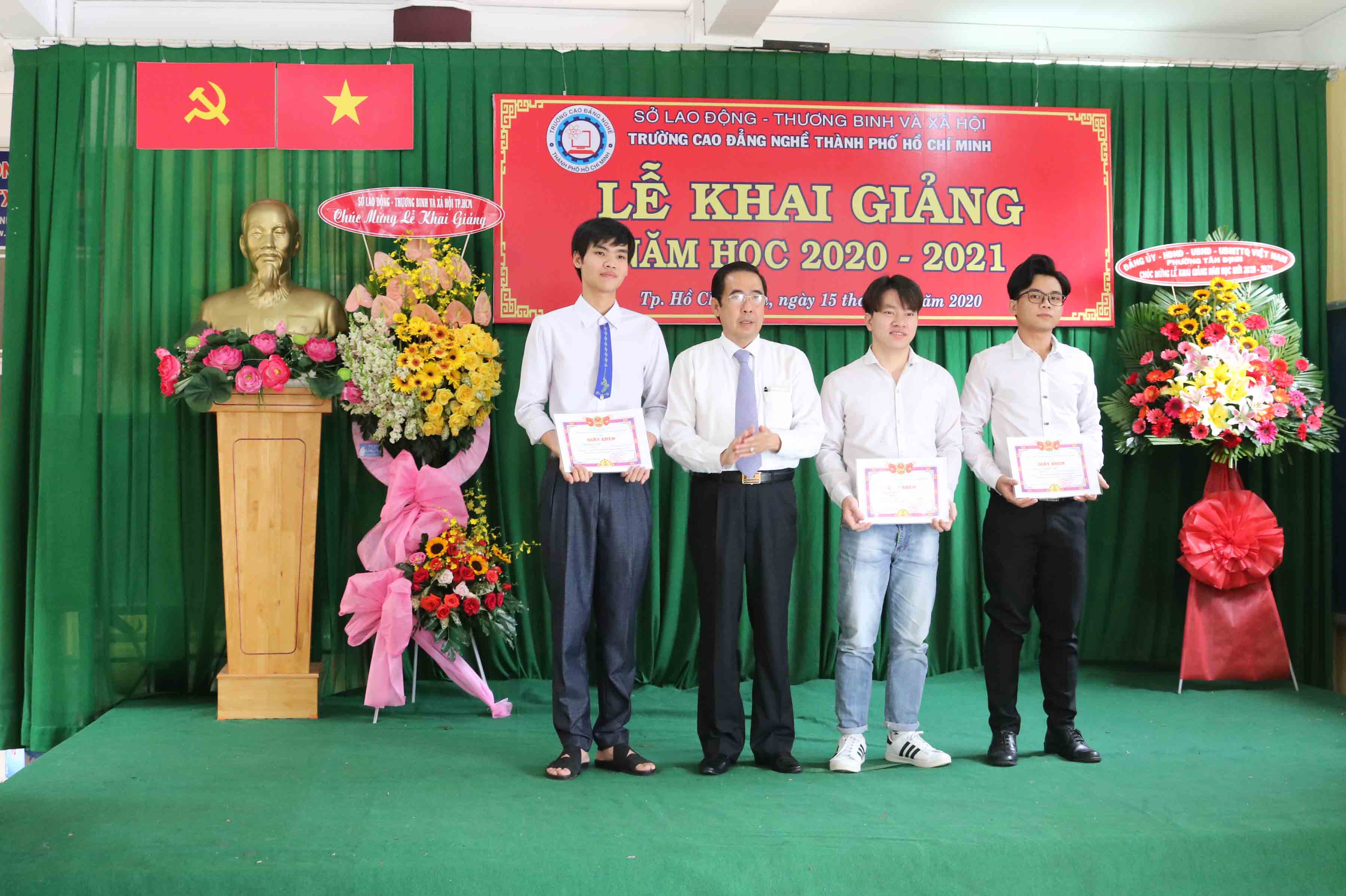 Ông Nguyễn Văn Lâm, Phó Giám đốc Sở LĐ - TBXH TPHCM khen thưởng các sinh viên của trường đoạt giải Kỳ thi Kỹ năng nghề Quốc gia năm 2020