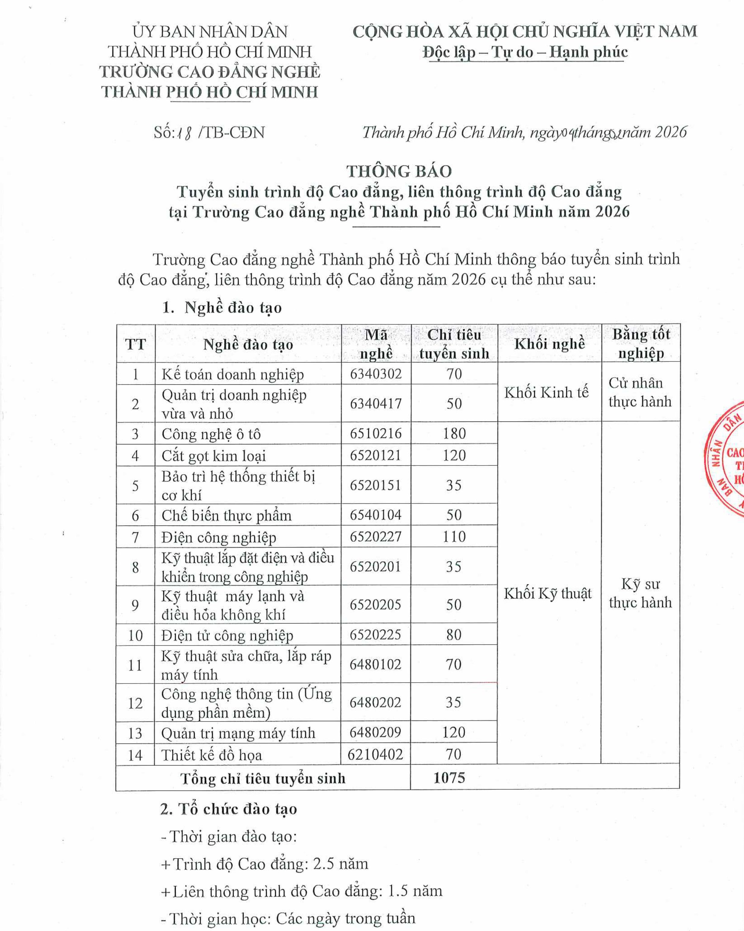 File thông báo tuyển sinh Cao đẳng, Cao đẳng liên thông năm học 2026 - 2027 Xem tại đây