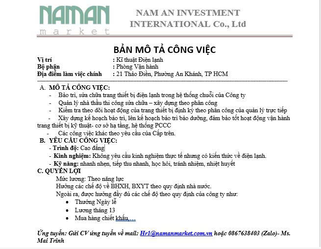 Công ty Nam An tuyển dụng Kỹ thuật viên Điện lạnh