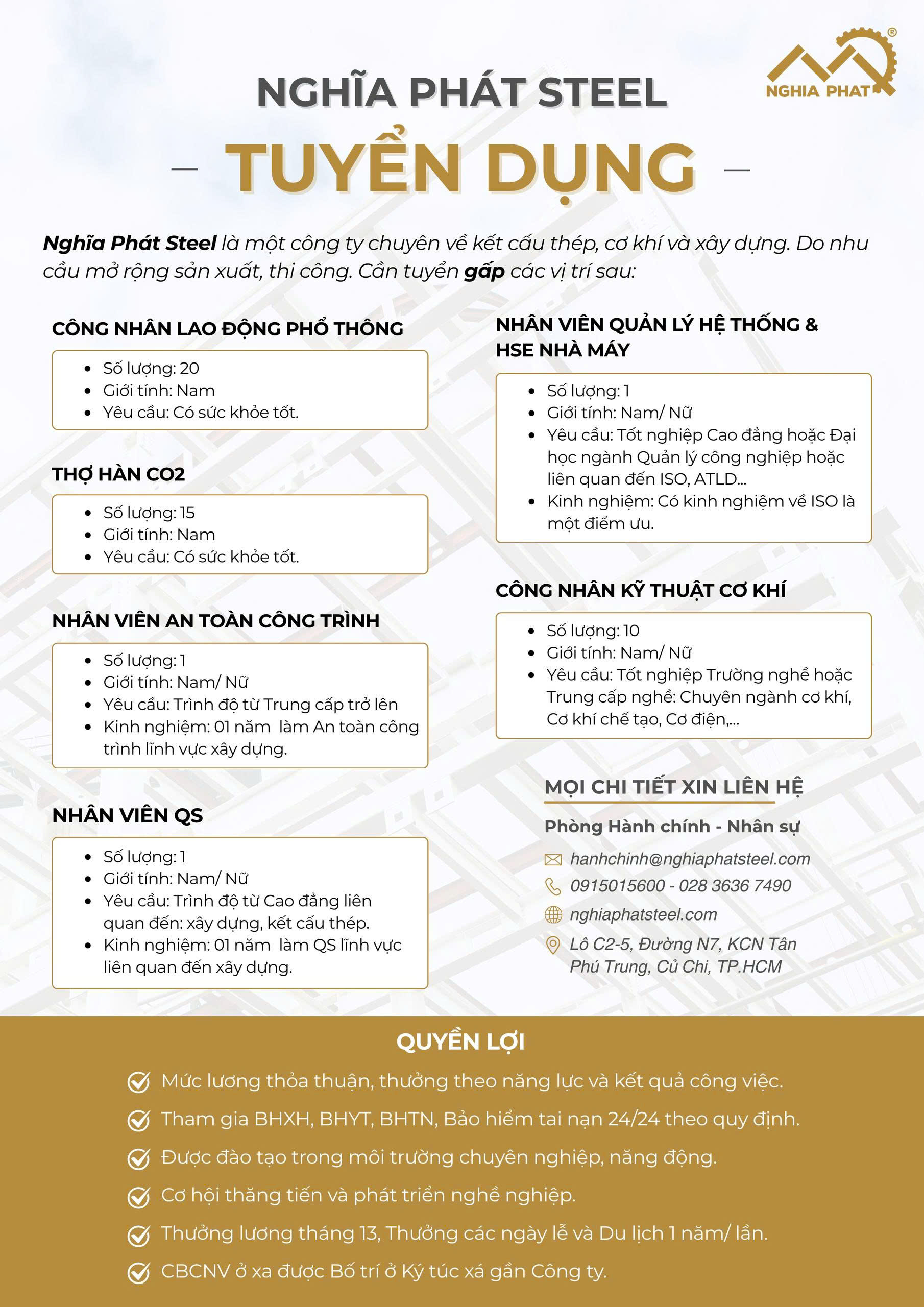 Công ty Nghĩa Phát Steel tuyển dụng nhiều vị trí kỹ thuật và lao động phổ thông