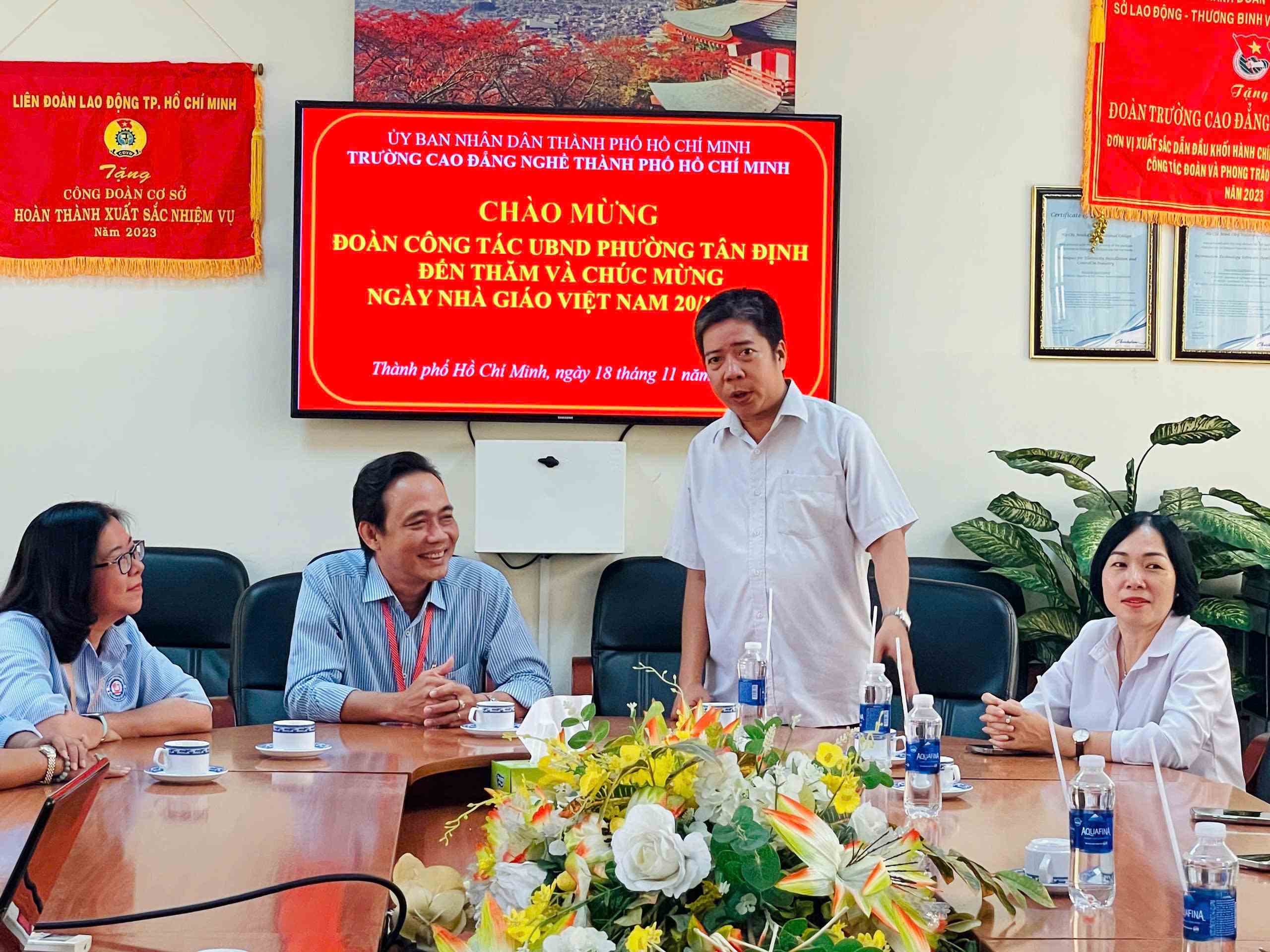 Nhân dịp kỷ niệm 42 năm ngày Nhà giáo Việt Nam 20/11/2024, lãnh đạo Ủy ban nhân dân phường Tân Định, Quận 1, TP.HCM đã đến thăm và chúc mừng tập thể Ban Giám hiệu, giảng viên Trường Cao đẳng Nghề TP.HCM. Chuyến thăm diễn ra trong không khí trang trọng, ấm áp, thể hiện sự quan tâm sâu sắc của chính quyền địa phương đến sự nghiệp giáo dục và đào tạo nghề trên địa bàn.
