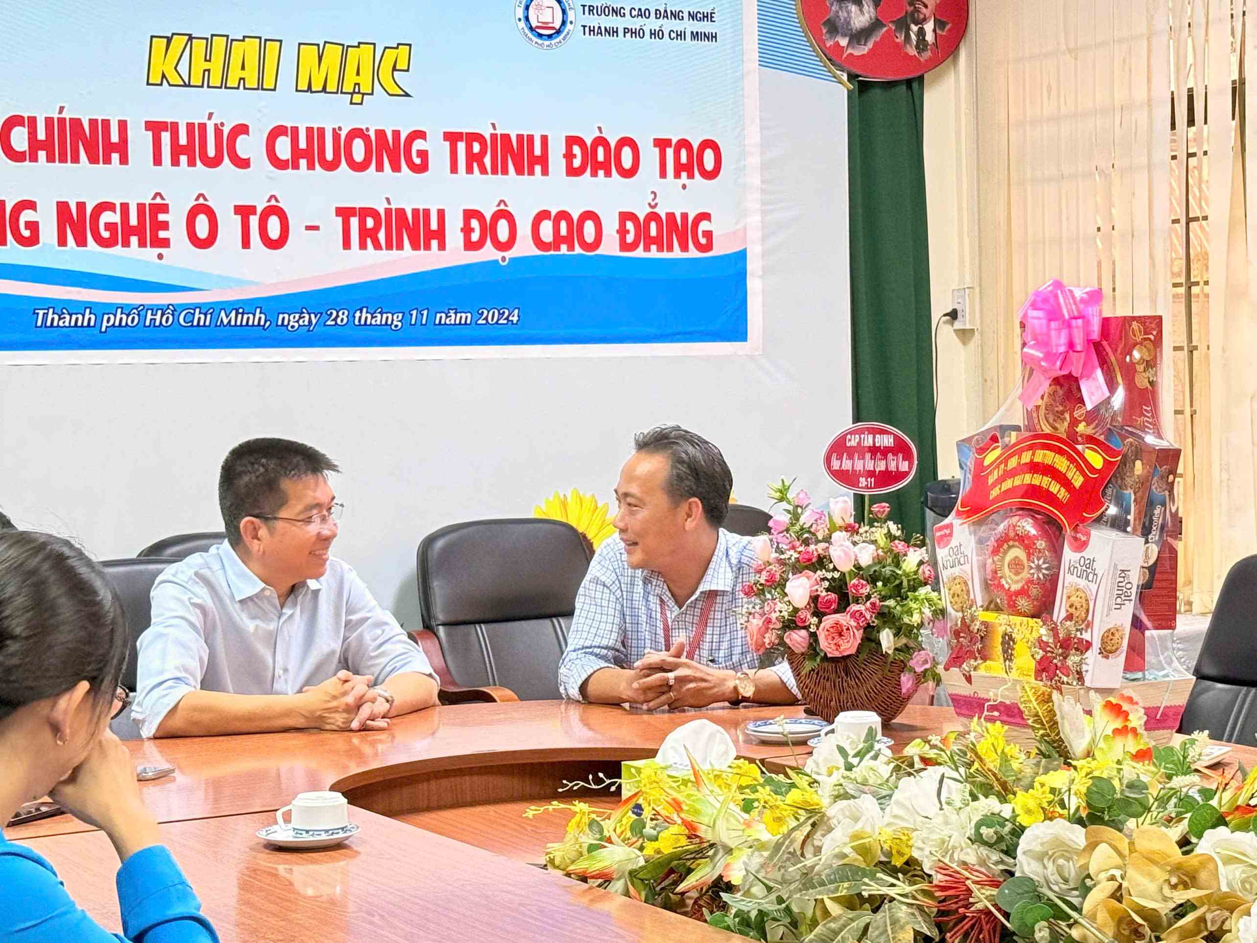 Ông Nguyễn Hải Quân - Phó Bí thư, Chủ tịch UBND phường Tân Định (bên trái) trao đổi với TS. Trần Kim Tuyền - Hiệu trưởng Trường Cao đẳng nghề Thành phố Hồ Chí Minh (bên phải)