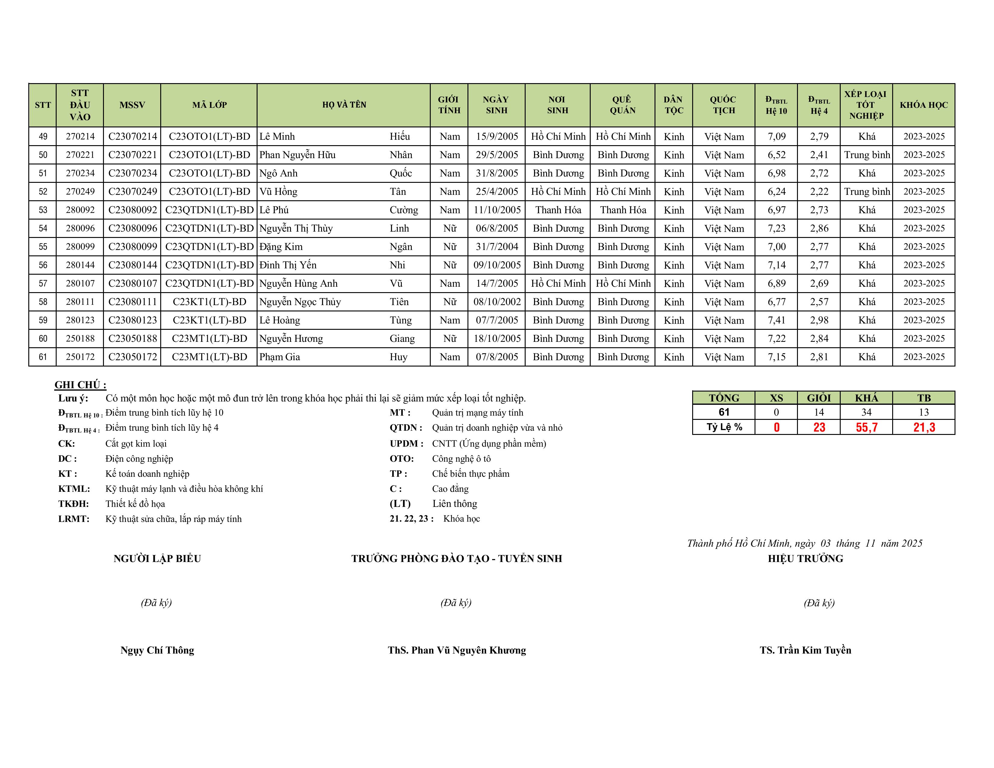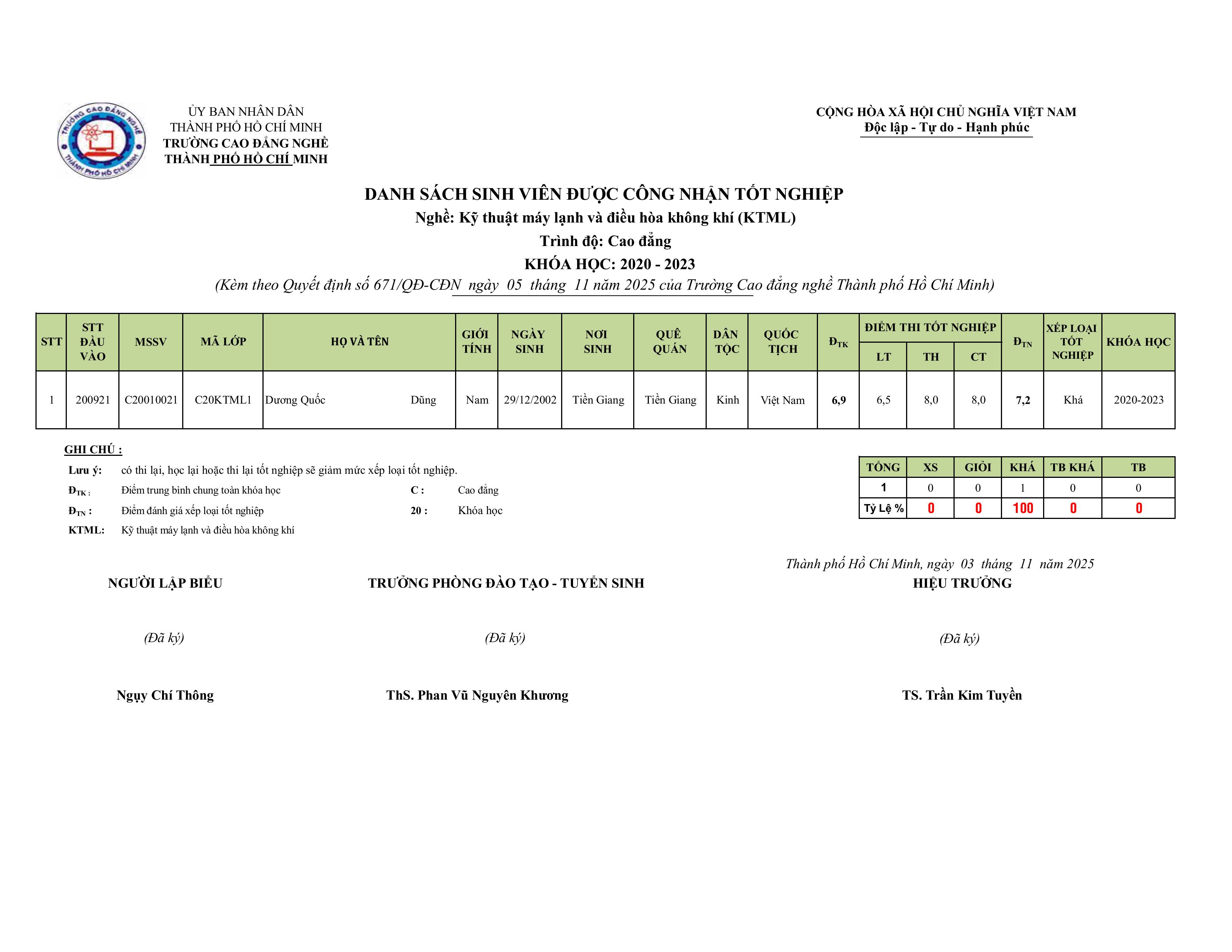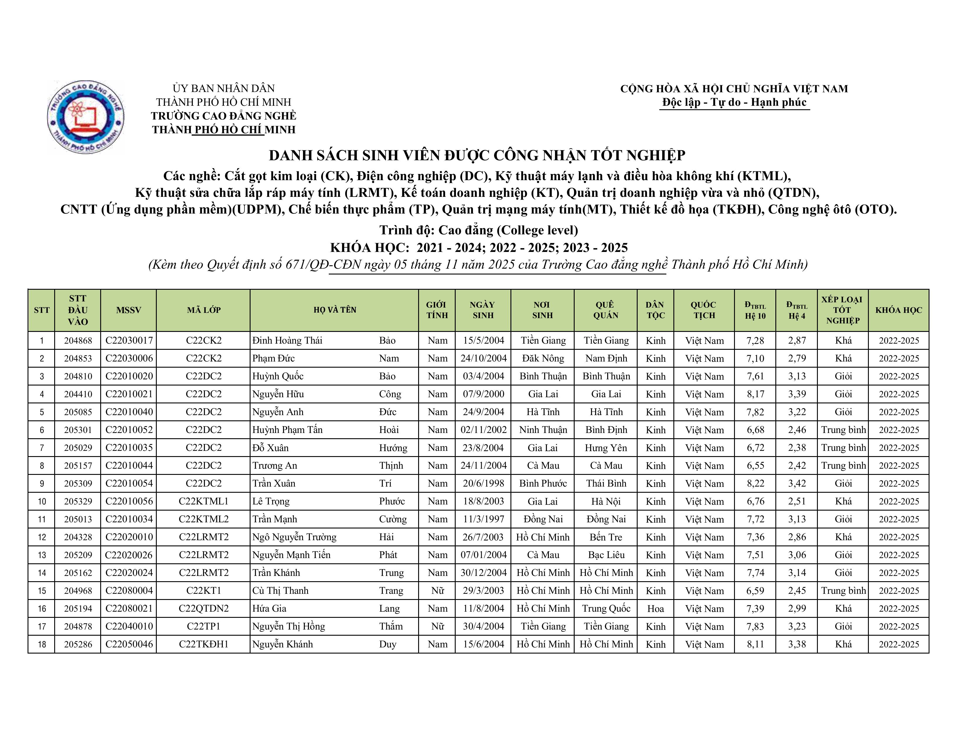 Quyết định công nhận tốt nghiệp Cao đẳng các khóa