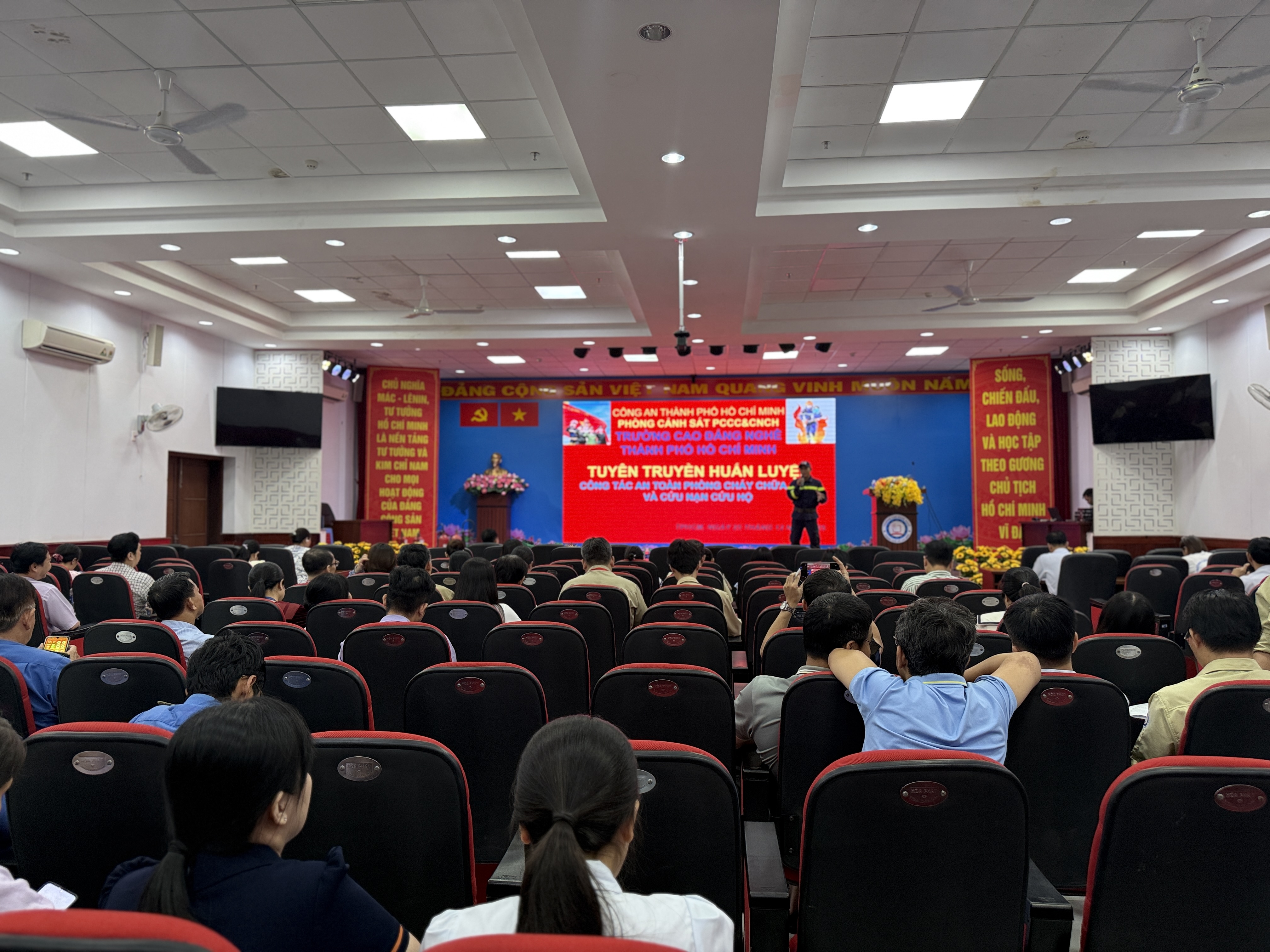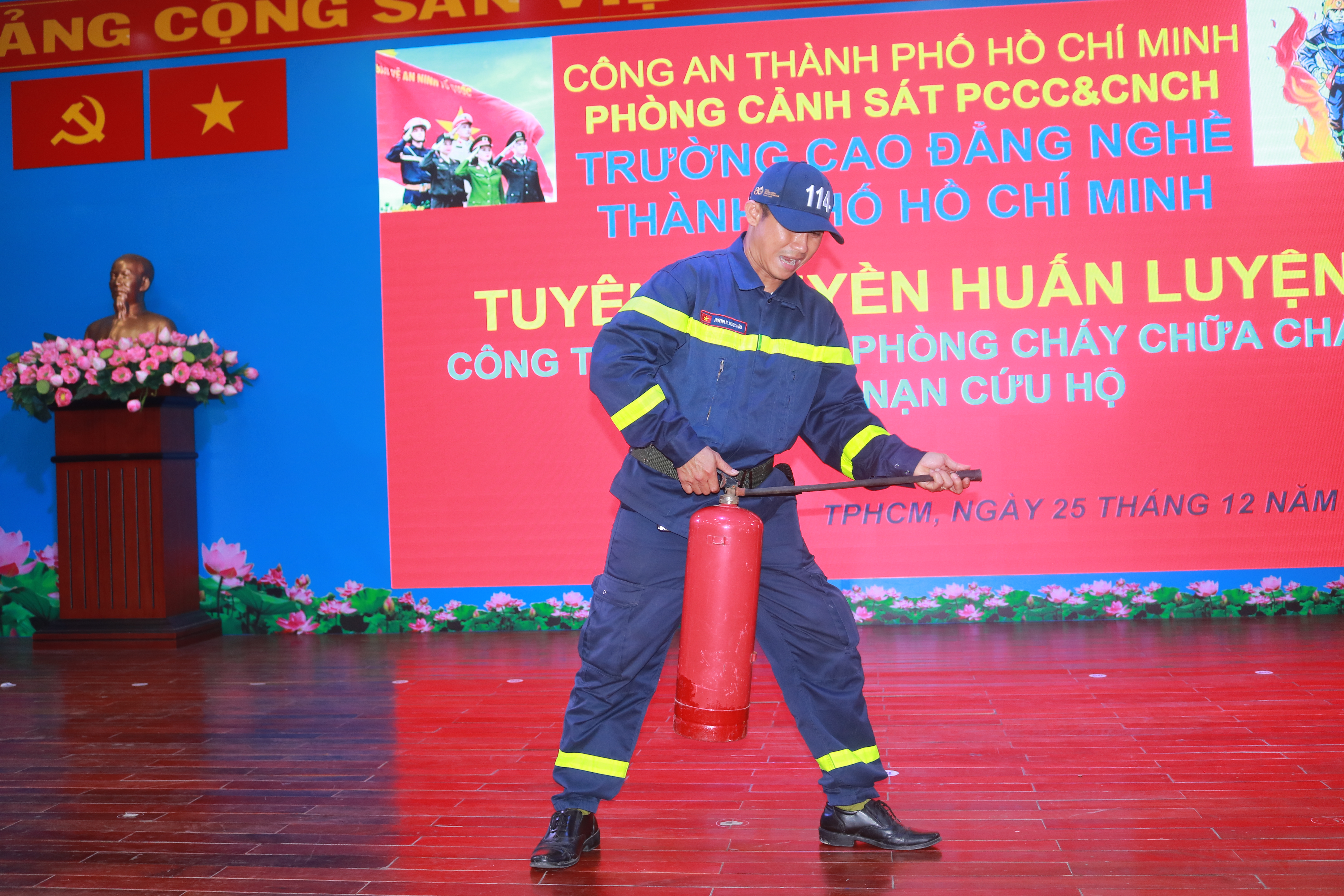 Buổi tập huấn có sự tham gia của đội phòng cháy chữa cháy và toàn thể viên chức, người lao động của Trường Cao đẳng nghề Thành phố Hồ Chí Minh. Báo cáo viên là đồng chí Huỳnh Nguyễn Ngọc Hậu – Cán bộ phòng cảnh sát phòng cháy chữa cháy cứu nạn cứu hộ công an Thành phố Hồ Chí Minh.
